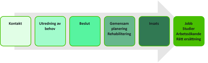 I den digitala Rehabiliteringsbanan kan tjänstepersoner både få vägledning kring sin egen arbetsprocess och få information om de andra aktörernas process med målgruppen. Pilen nedan illustrerar individens väg mot egen försörjning och arbetsprocessen där alla aktörer inom Rehabiliteringsbanan är involverade på olika sätt. Pilen är uppdelad i sex faser och varje fas innehåller ett eller flera steg inom aktörernas olika arbetsprocesser.
